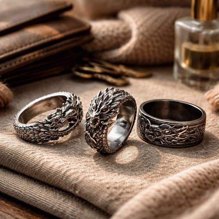 Le secret, c’est le contraste : une tenue simple + une pièce forte, plutôt qu’un total look chargé. Exemple facile : jean droit, pull uni, manteau structuré, chaussures sobres. La bague devient le détail “signature”. Si votre dragering est très sculpté, évitez de multiplier les autres bijoux sur la même main (bagues fines, grosses chaînes, etc.). Et si vous voulez rester discret : choisissez un dragon gravé ou une texture écaille légère. C’est la version “mystère élégant”, pas “costume de scène”.
