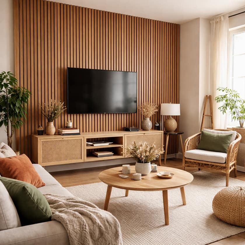 Pour un salon moderne, les panneaux à tasseaux (souvent sur feutrine) donnent un rendu graphique très net, surtout derrière un mur TV ou un canapé. Ils créent de la verticalité et “habillent” sans surcharger. Si vous aimez les ambiances plus minimalistes, un MDF plaqué bois offre une surface plus lisse, plus chic, avec moins de relief. Pensez aussi à la lumière : en pièce peu lumineuse, choisissez une teinte claire. Et si vous installez près d’un espace de vie très utilisé, privilégiez une finition facile à dépoussiérer et des bords bien finis.